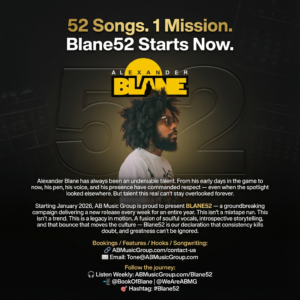 #Blane52 is a year-long music marathon by Alexander Blane: 52 songs in 52 weeks throughout 2026. Every drop captures a page of Blane’s journey—love, heartbreak, grind, faith, healing—no gimmicks, just undeniable music.